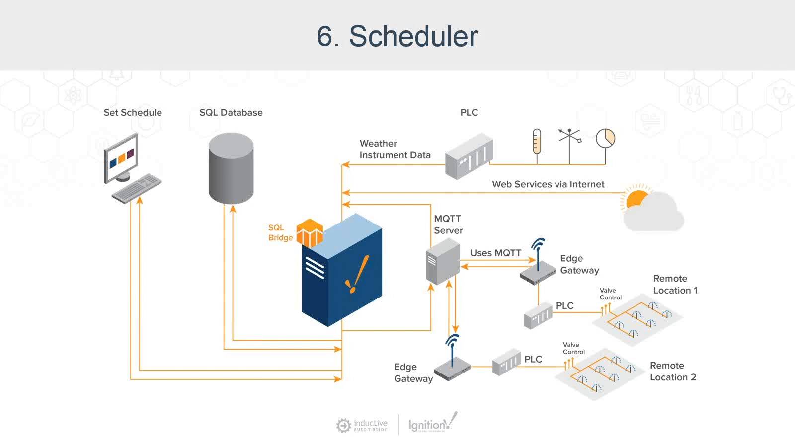 Su base de datos puede comunicar un cronograma a los PLC para funciones basadas en el tiempo en el Módulo SQL Bridge. Por ejemplo, la comunicación con un sistema de rociadores a gran escala podría permitir que un operador programe los controladores de válvulas para encender y apagar el sistema según la hora del día. Al conectar los controladores a través de un PLC a la base de datos, SQL Bridge puede enviar un cronograma cronometrado al sistema o cambiar el cronograma si variables como el clima afectarían el proceso. Estos mensajes podrían conectarse potencialmente a través de MQTT a SQL Bridge y la base de datos, o con una forma más básica de entrega de mensajes. MQTT permite enviar datos a una base de datos, en lugar de extraer valores de un sistema remoto.